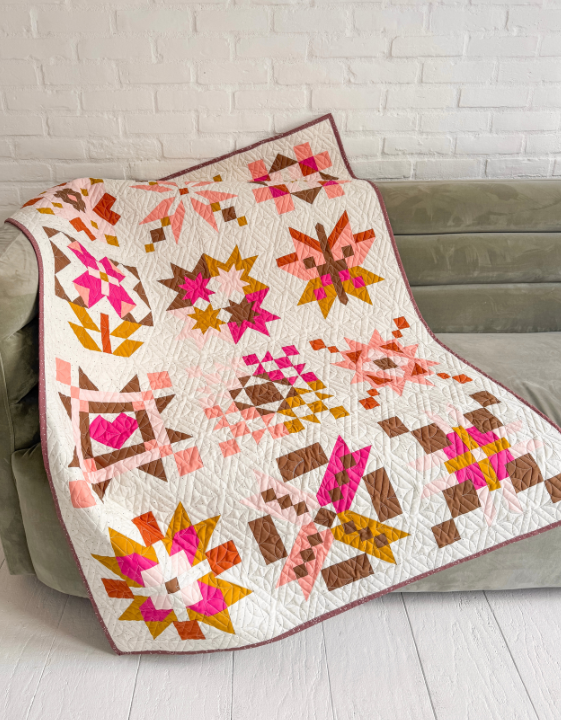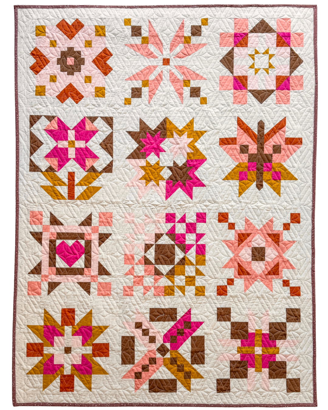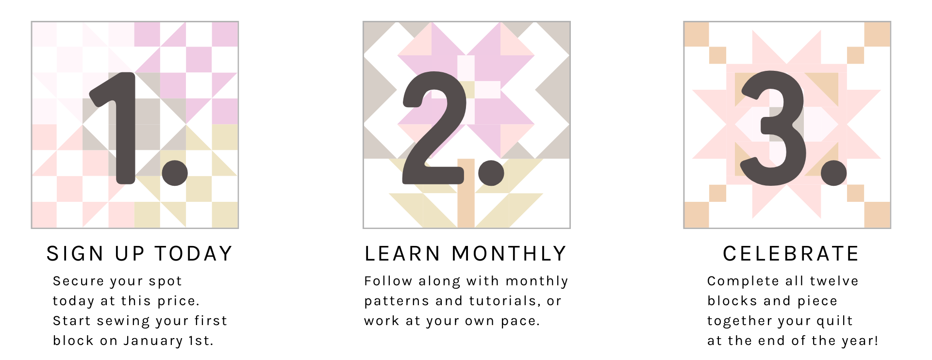 Make one unique block each month with video tutorials, community support, and end up with a throw-size quilt in December.