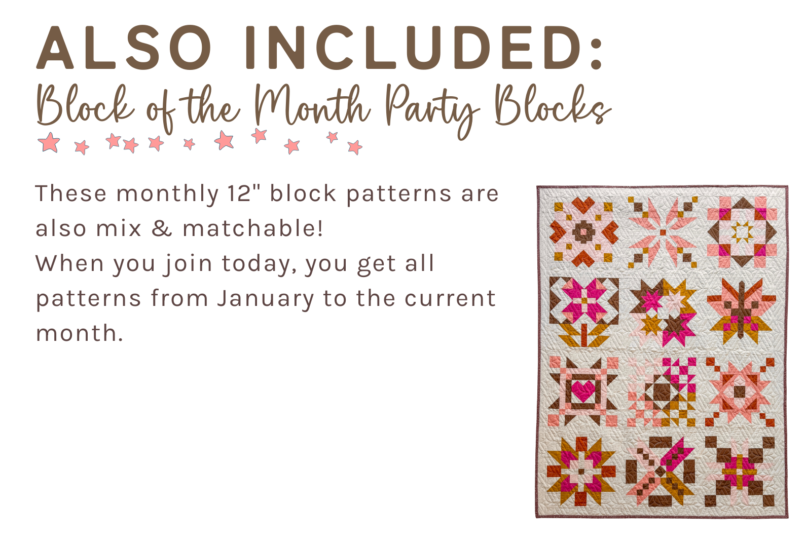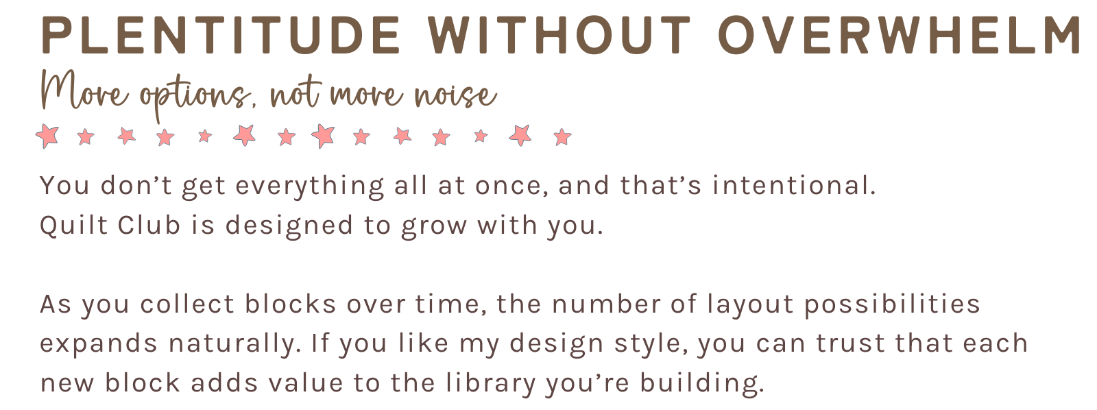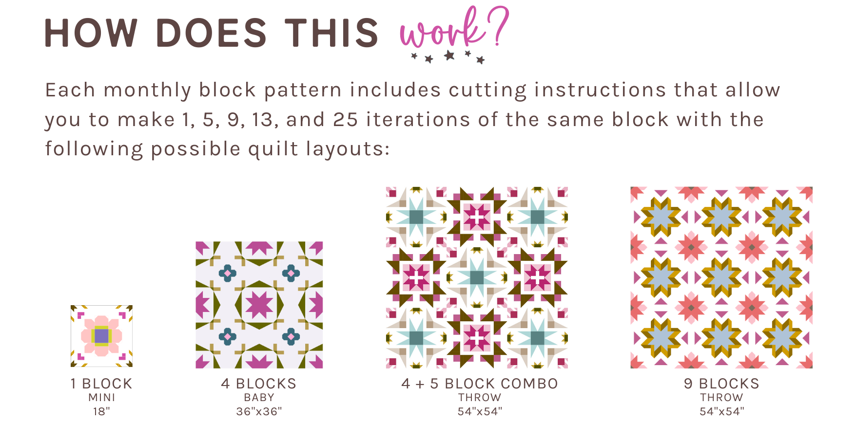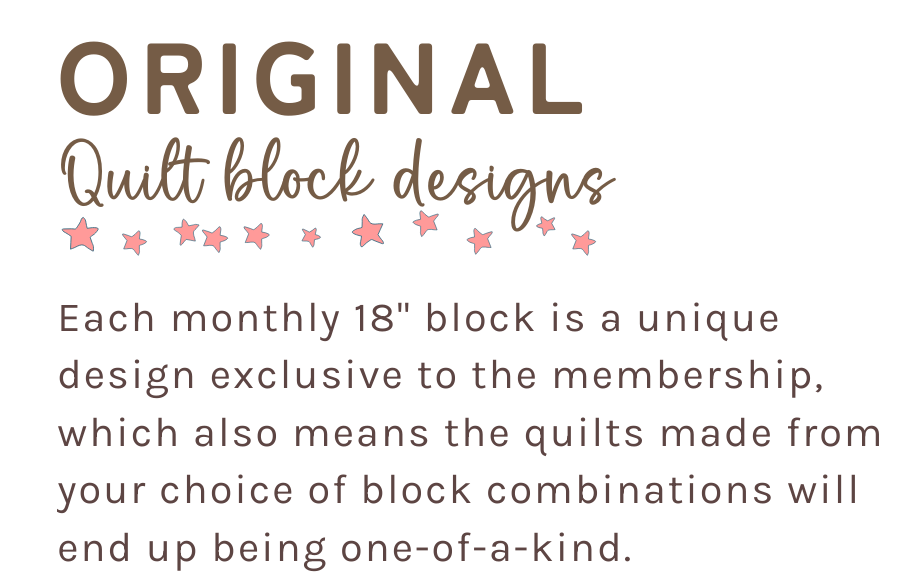 The Quilt Club was designed to honor the time commitment and speed at which every quilter makes quilts. There is no pressure to make a quilt every month. Quilt at your own pace and as the time passes, you will have accumulated more layout options to choose from when it is time to make your next quilt.